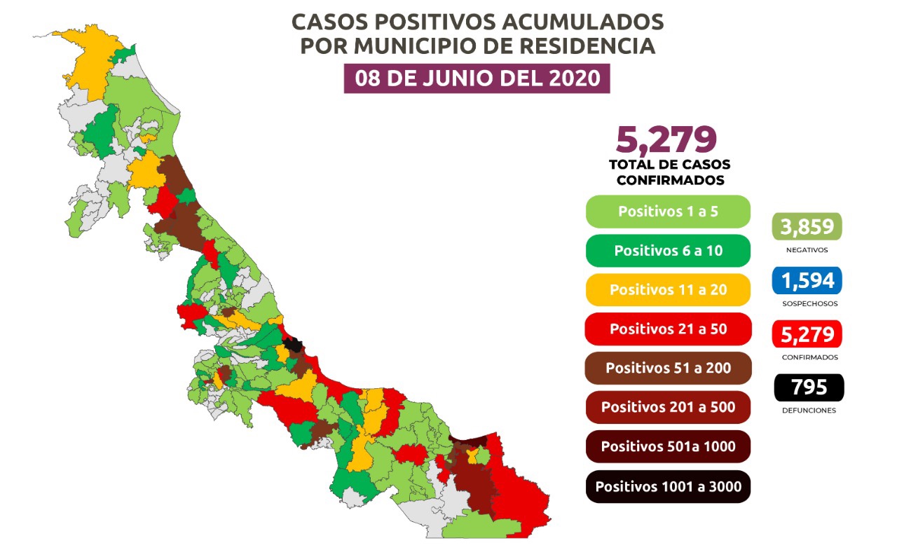 La cifra de positivos acumulados es de 5 mil 279 en 147 demarcaciones; 2 mil 863 recuperados, mil 621 en vigilancia y 663 activos: Veracruz *1978*, Coatzacoalcos *570*, Poza Rica *410*, Boca del Río *226*, Minatitlán *225*, Córdoba *139*, Tuxpan *124*, Xalapa *121*, Cosoleacaque y Medellín *88*, Orizaba *79*, Papantla *77*, Cosamaloapan *60*, Coatzintla *57*, Fortín *43*, San Andrés Tuxtla *42*, Alvarado y Tihuatlán *40*, Nanchital *37*, Las Choapas y Martínez de la Torre *33*, Perote *31*, La Antigua *29*, Tierra Blanca *28*, Agua Dulce *27* y Río Blanco *24*.
