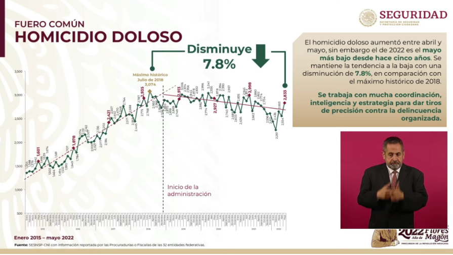 La SSPC apuntó que el promedio de homicidios dolosos en los primeros cinco meses del año es de 84 víctimas diarias, “esto representa una reducción de 10.8 por ciento con respecto a 2021”.
