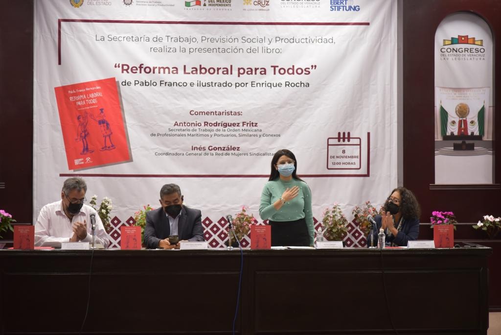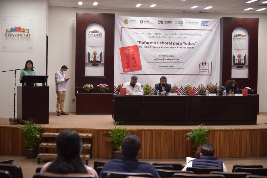 En el auditorio Sebastián Lerdo de Tejada del Palacio Legislativo, se llevó a cabo la presentación del libro Reforma laboral para todos, encabezada por la secretaria de Trabajo, Previsión Social y Productividad del Gobierno del Estado de Veracruz, Dorheny García Cayetano. Comentaron la obra el autor, Pablo Franco, el secretario de Trabajo de la Orden Mexicana de Profesionales Marítimos y Portuarios, Similares y Conexos, Antonio Rodríguez Fritz, y la coordinadora general de la Red de Mujeres Sindicalistas, Inés González. El libro, editado por la fundación Friedrich Ebert Stiftung, contiene ilustraciones de Enrique Rocha. Asistió también la diputada local Adriana Esther Martínez Sánchez, así como autoridades de los ámbitos jurídico, laboral y académico.