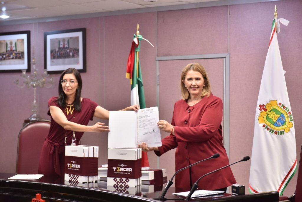 En cumplimiento a lo dispuesto en la fracción XXI del artículo 49 de la Constitución Política del Estado de Veracruz de Ignacio de la Llave, la presidenta de la Mesa Directiva de este Poder, diputada Cecilia Josefina Guevara Guembe, recibió, de la jefa de la Oficina de Programa de Gobierno, Waltraud Martínez Olvera, el Tercer Informe de Gobierno del ingeniero Cuitláhuac García Jiménez, gobernador constitucional del estado. En la sala de sesiones Venustiano Carranza, ante el presidente de la Junta de Coordinación Política, diputado Juan Javier Gómez Cazarín, y en presencia del diputado Hugo González Saavedra y de la legisladora Arianna Guadalupe Ángeles Aguirre, vicepresidente y secretaria de la Mesa Directiva, respectivamente, la Presidenta de este órgano legislativo subrayó que, de acuerdo con el procedimiento, este Informe será remitido a todos los integrantes de la LXVI Legislatura para que conozcan su contenido. Asimismo, indicó que, en cumplimiento a lo dispuesto por el artículo 26 constitucional, este Poder celebra hoy el ejercicio democrático y de rendición de cuentas mediante el cual el titular del Ejecutivo, ingeniero Cuitláhuac García Jiménez, da cuenta de las acciones emprendidas y de los resultados obtenidos durante su tercer año de mandato. La legisladora expuso que las y los veracruzanos pueden tener la certeza plena de que se avanza con paso firme y claridad de rumbo hacia un futuro que garantice bienestar y progreso en todas las regiones de la entidad “principalmente en aquellas que, por décadas, permanecieron en el olvido por la insensibilidad y carencia de compromiso en sus autoridades”, añadió. Manifestó que, en este 2021, al igual que en 2020, las complicaciones de la pandemia que se sigue enfrentando no fueron impedimento alguno para que la administración estatal actúe con responsabilidad, siempre en estricto apego a la legalidad, con transparencia y austeridad.