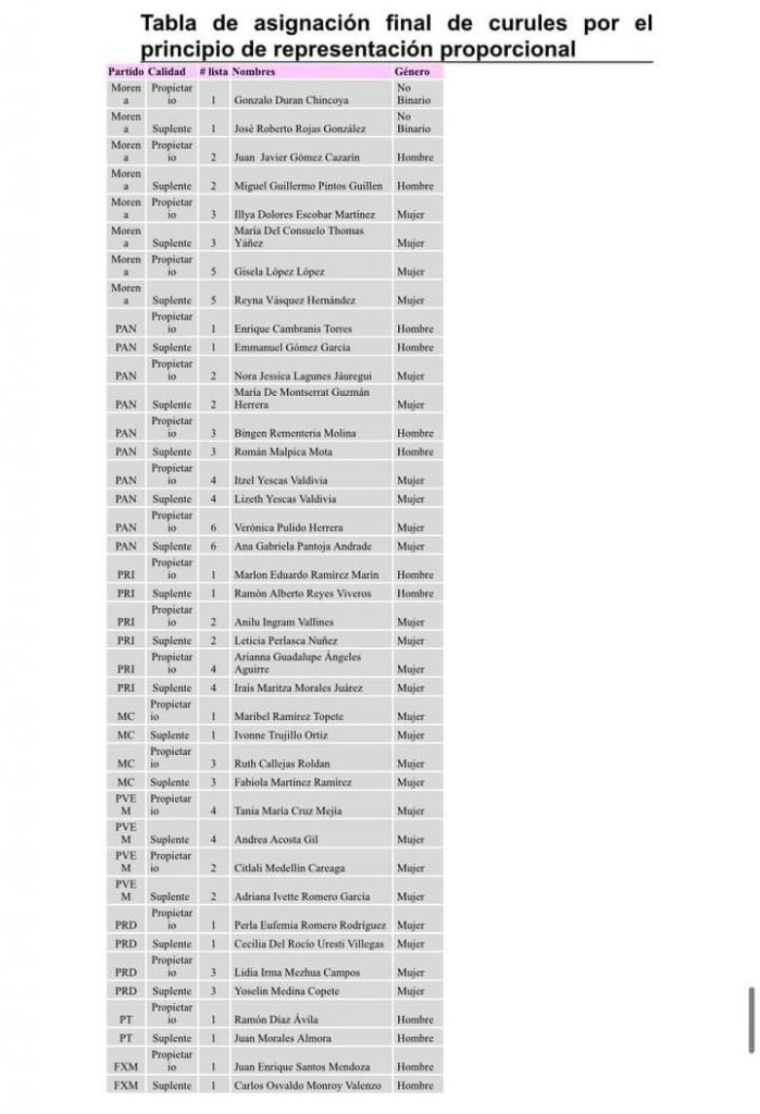 En el caso concreto de Morena, quienes entrarán como plurinominales serán Illya Dolores Escoba Martínez, Gisela López López, Gonzalo Durán Chincoya (persona no binaria) y Juan Javier Gómez Cazarín.